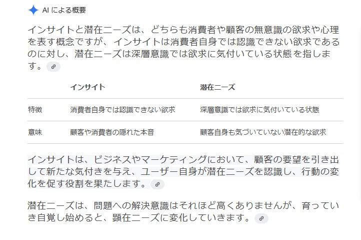 たとえば、Google検索のサジェストで出てくるキーワード「インサイト 潜在ニーズ 違い」では、下記のような定義が紹介されます
