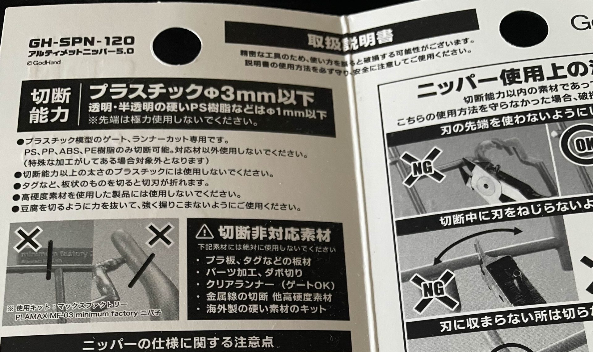 今回の原因も、アルティメットニッパー上部記載の「下記素材には絶対に使用しないでください」記載部分の「プラ板、タグなどの板材」に使ったことが原因です。